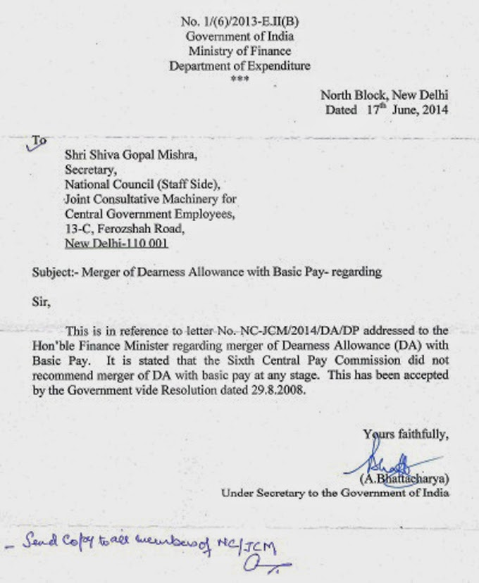 Finance Ministry once again ruled out any possibility of merger of D.A. with basic pay for Central employees. In a letter addressed to National Council Secretary Shri Shiva Gopal Mishra on 17.6.2014, regarding the main demand of merger of dearness allowance with basic pay, Govt sticking on the resolution taken on 29.08.2008 in respect of definite proposal of Sixth Pay Commission (No merger of D.A.).